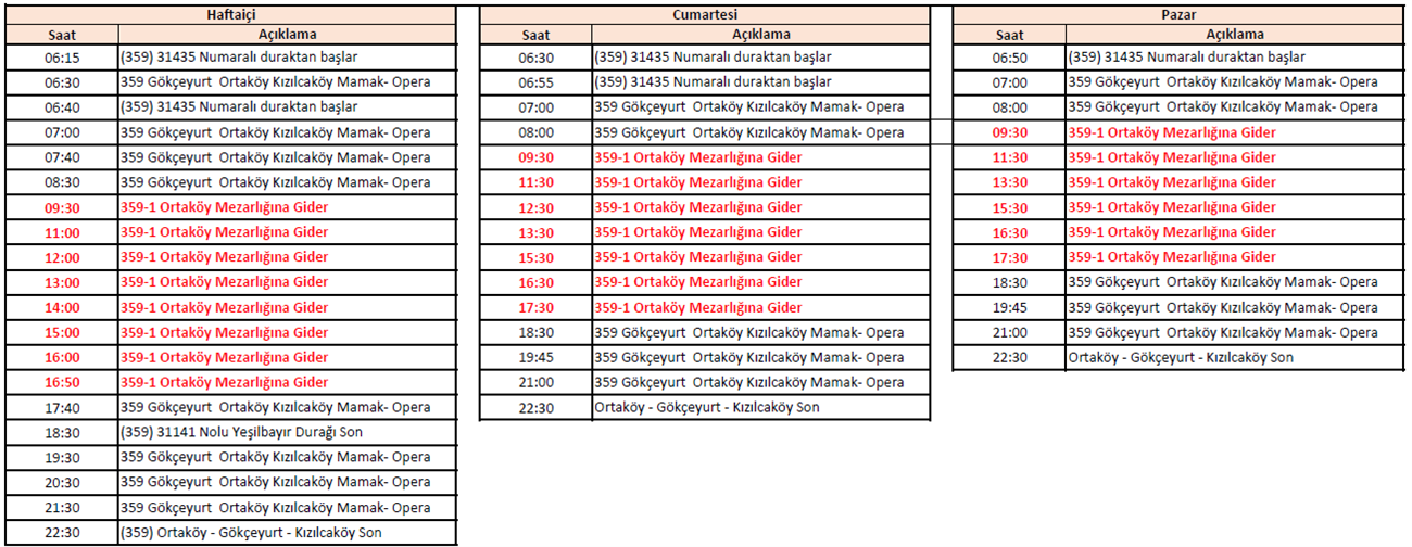 Mevcut güzergahımızdaki EGO Cepte sorunlarının giderilmesi ve vatandaşların memnuniyetlerinin artırılması için, Ankara Büyükşehir Belediyesi Ortaköy Mezarlığına gidecek yolcularımız için 359-1 Gökçeyurt- Ortaköy- Ortaköy Mezarlığı- Kızılcaköy- Mamak- Opera hattı açılmış olup, 07.03.2025 tarihinden itibaren aşağıda belirtilen güzergah ve servis saatleri ile hizmet verilecektir. Kuruluşumuzun resmi internet sitesi ve EGO CEPTE mobil uygulaması üzerinden güncel olarak ulaşabilirsiniz.Not: 359 Gökçeyurt – Ortaköy- Kızılcaköy- Mamak- Opera hattımızın güzergahı ve servis saatleri ile ilgili herhangi bir değişiklik yapılmamıştır.