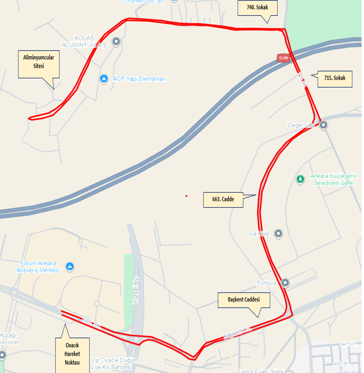 Güzergâh: Ovacık Otobüs Hareket Noktası ‘ndan başlayarak, 695. Sokak, Başkent Caddesi, 663. Cadde, 715. Sokak, 740. Sokak, Alüminyumcular Sanayi Sitesi içerisinden U dönüşü ile 740. Sokak, 715. Sokak, 663. Cadde, Başkent Caddesi, 695. Sokak, Ovacık Otobüs Hareket Noktası.
