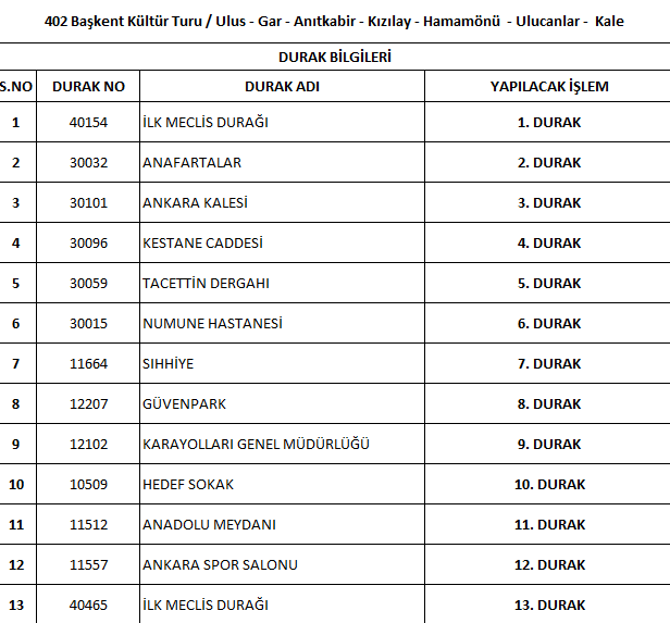 Başkent Ankara’da yaşayan ve Ankara dışından gelerek kentimizi ziyaret eden yerli ve yabancı konuklara Ankara’nın tarihi, kültürel değerlerinin tanıtılması, misafirlerimizin kentte geçirdikleri süreyi artırmak ve tarihi turistik noktalara erişimlerini kolaylaştırmak amacıyla yeni bir hat güzergahı planlanmış olup, 07.06.2025 tarihi itibariyle aşağıda bulunan güzergâhta hizmet verilmeye başlanacaktır.