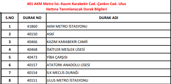 401 AKM Metro İst.-Kazım Karabekir Cad.-Çankırı Cad.-Ulus Hattına Tanımlanacak Durak Bilgileri