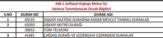 446-1 Solfasol-Dışkapı Metro İst. Hattına Tanımlanacak Durak Bilgileri