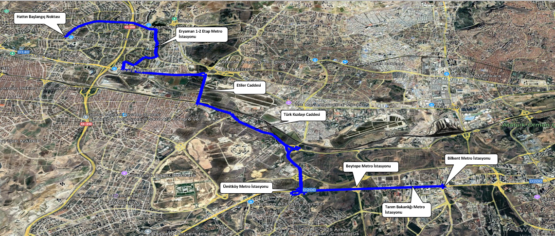 | 641-1 Eryaman--Bilkent Metro İstasyonu: Dumlupınar 30 Ağustos Caddesi, 1. TBMM Caddesi, Selçuklular Caddesi, Osmanbey Caddesi, Domaniç Caddesi, Söğüt Caddesi, Orhan Bey Caddesi, Ayaş Ankara Yolu Bulvarı, Etiler Caddesi, İstasyon Caddesi, Türk Kızılayı Caddesi, Ümitköy Metro İstasyonu, Dumlupınar Bulvarı, Beytepe Metro İstasyonu, Tarım Bakanlığı-Danıştay Metro İstasyonu, Bilkent Metro İstasyonu, Dumlupınar Bulvarı, Bilkent Bulvarı, Dumlupınar Bulvarı, Doğan Taşdelen Bulvarı, 1978. Cadde, 2433. Sokak, Ümitköy Metro İstasyonu, Dumlupınar Bulvarı, Şaşmaz Bulvarı, Şaşmaz Kavşağı, Tükkızılayı Caddesi, İstasyon Caddesi, Etiler Caddesi, Ayaş Ankara Yolu Bulvarı, Orhan Bey Caddesi, Söğüt Caddesi, Domaniç Caddesi, Osmanbey Caddesi, Selçuklular Caddesi, 1. TBMM Caddesi, Dumlupınar 30 Ağustos Caddesi. |