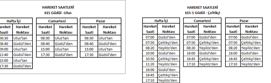 04 Temmuz 2025 tarihi itibarıyla 615- Güdül -Ulus hat numaralı otobüslerimizin servisleri Güdül ilçe merkezinde sona erecek olup;