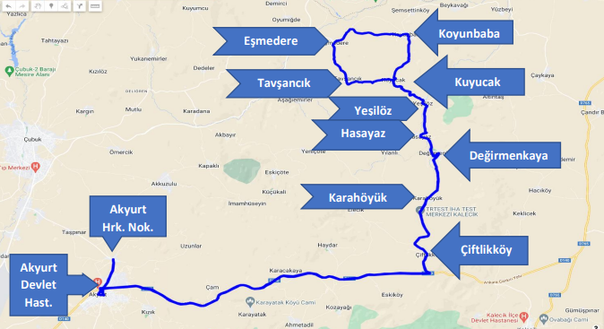 Akyurt-Çiftlikköy-Karahöyük-Değirmenkaya-Hasayaz-Yeşilöz-Kuyucak-Koyunbaba-Eşmedere-Tavşancık
