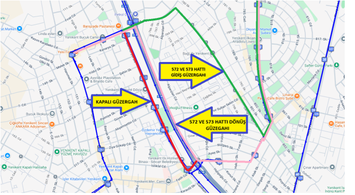 Ayaş Ankara Yolu Bulvarı Cezaevi Kavşağında başlatılan köprülü kavşak çalışması nedeniyle 572, 573, hatlarında araçlarımız 50053, 50103, 50105, 50107, 50055, 51357, 51360, 51359, 51358, 51356 nolu EGO duraklarına geçici olarak hizmet veremeyecektir. Gidiş güzergahında 64. Cadde Cengiz Topel Caddesi ve Mevlana Caddesi kullanılarak güzergaha bağlanacaktır. Dönüş güzergahında ise Dicle Sokak, Ankara Ayaş Yolu Bulvarı ve Kazım Karabekir Caddesini kullanarak güzergaha bağlanacaktır.