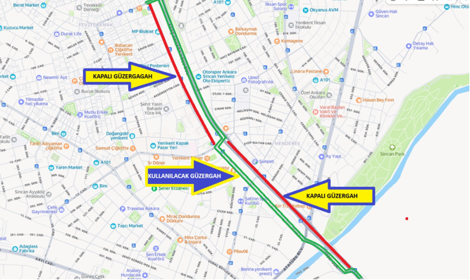 Ayaş Ankara Yolu Bulvarı , Cezaevi Kavşağında başlatılan köprülü kavşak çalışması nedeniyle 503 , 503-1, 504 , 504-6 , 572, 573 hatlarımızın güzergahları üzerinde bulunan Ayaş Ankara Yolu Bulvarı ve Cumhuriyet Bulvarının 01.09.2025 tarihi itibari ile kapatılması planlanmakta olup araçlarımız krokide belirtildiği şekilde Ankara Ayaş Yolu Bulvarından sağa Cumhuriyet Bulvarını takiben 1052 sokağı kullanarak güzergaha bağlanacaktır. Çalışmalar tamamlanana kadar güzergah üzerinde bulunan 50053, 50077, 50103, 50102, 50105, 50104, 50107, 50106, 50055, 50078, 56875, 56874 numaralı duraklara geçici olarak hizmet verilemeyecektir.