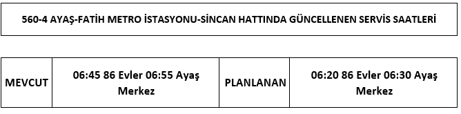 Vatandaşlarımızdan gelen talepler doğrultusunda, 560-4 Ayaş-Fatih Metro İstasyonu-Sincan hattımızın hafta içi saatli tarifelerinde 15.09.2025 Pazartesi günü itibariyle tabloda belirtilen şekilde düzenlemeye gidilecektir.