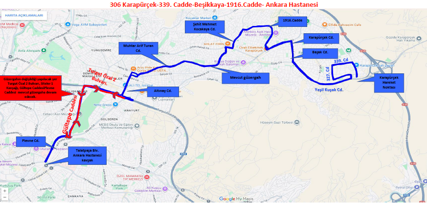 Kuruluşumuz EGO Genel Müdürlüğünce Karapürçek, Beşikkaya , Feridun Çelik , Battalgazi Mahallelerinden Altındağ İlçesi, İmar ve Şehircilik Müdürlüğü, Emlak ve İstimlak Müdürlüğü, Mali Hizmetler Müdürlüğü, Bilgi İşlem Müdürlüğü ve Hukuk İşleri Müdürlüğüne ulaşım hizmetin sağlanabilmesi amacıyla 306 Karapürçek-339. Cadde-Beşikkaya-1916.Cadde- Ankara Hastanesi hattının güzergahı yeniden planlanmış olup, 27.10.2025 tarihinden itibaren aşağıda belirtilen güzergahtan hizmet verecektir.Hattın servis saatleri hizmet verilmeye başlanan tarihten itibaren Kuruluşumuz internet sitesinde ve EGO CEPTE uygulamasında yayınlanacaktı