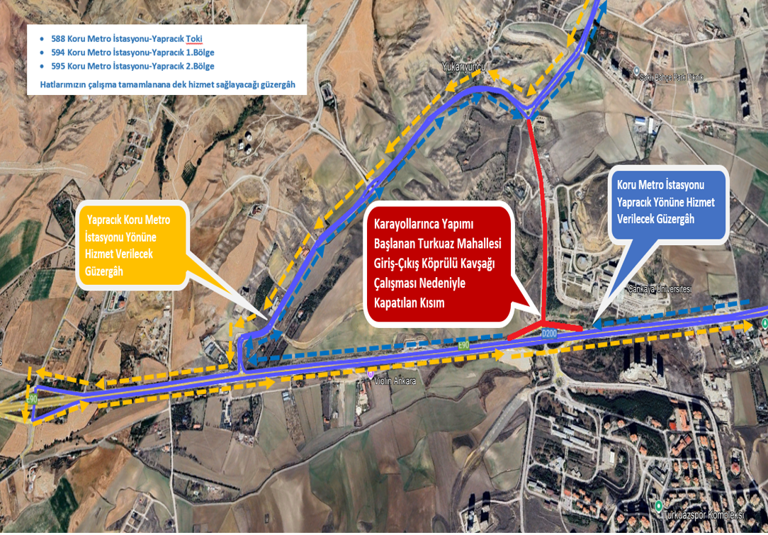 Karayolları 4. Bölge Şube Müdürlüğü tarafından başlatılan Turkuaz Mahallesi giriş çıkış köprülü kavşak çalışması dolayısıyla, Yapracık ve Turkuaz TOKİ Bölgelerine hizmet sağlayan  otobüs hatlarımızın güzergâh ve duraklarında geçici olarak değişiklik yapılmıştır.