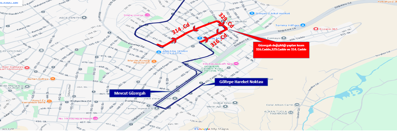 Göltepe hareket noktasından verilen 304 Kırkkonaklar-GOP-Kuğulu-15 Temmuz Kızılay Milli İrade Meydanı-Sıhhiye-Ulus güzergahı yeniden planlanmış olup, 14/11/2025 tarihi itibaren aşağıda belirtilen güzergahtan hizmet verecektir.