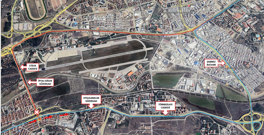 Milli Savunma Bakanlığı ile Devlet Hava Meydanları İşletmesi Genel Müdürlüğü arasında imzalanan protokol doğrultusunda “Etimesgut Askeri Hava Limanı pat sahaları onarımı 2. etap ve devlet konuk evi “ yapımı kapsamında mevcut pist uzatılacak olup, bu kapsamda Etimesgut İlçesi Etiler Caddesi’nin Ayaş Yolu Bulvarı ile Kadri Suyabakan İlköğretim Okulu arasında kalan kısmının; 21.09.2025 tarih ve 10433 karar sayılı Cumhurbaşkanı kararı kapsamında havalimanı sınırları içerisinde kalacağından yaya ve taşıt trafiğine kapatılmıştır.