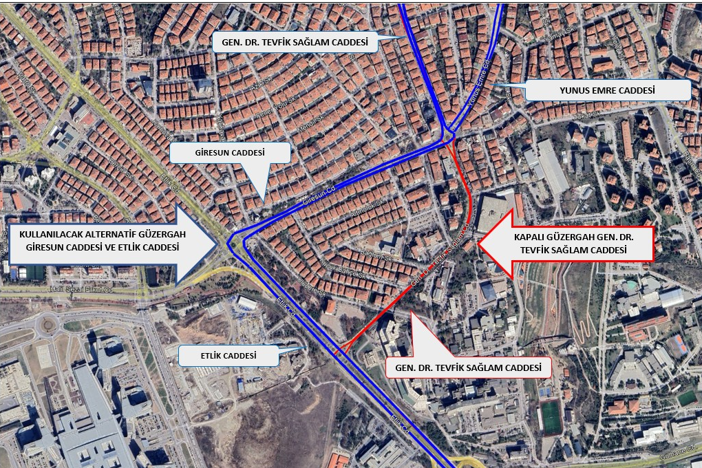 Gen. Dr. Tevfik Sağlam Caddesi üzerinde devam eden altyapı çalışması kapsamında Gen. Dr. Tevfik Sağlam Caddesi ‘nin Aşağı Eğlence Kavşak ile Etlik Caddesi arasında kalan kısmı araç geçişine kapatılmış olup, 20986-20987 ve 20988-20989 numaralı duraklardan geçici bir süre ile hizmet verilemeyecektir. Güzergâh açılana kadar 263, 258, 267, 284, 285, 286 ve 288 numaralı güzergahlarımız, Gen. Dr. Tevfik Sağlam Caddesi, Giresun Caddesi ve Etlik Caddesi takiben servislerine devam edeceklerdir.