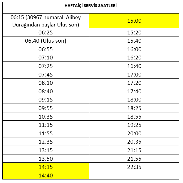 395- Doğantepe-4 Cadde-Siteler-Gülveren-Sıhhiye-Ulus hattının Haftaiçi servis saatleri artırılmış olup, 03.12.2025 tarihinden itibaren aşağıda belirtilen yeni servis saatleri ile hizmet verecektir.