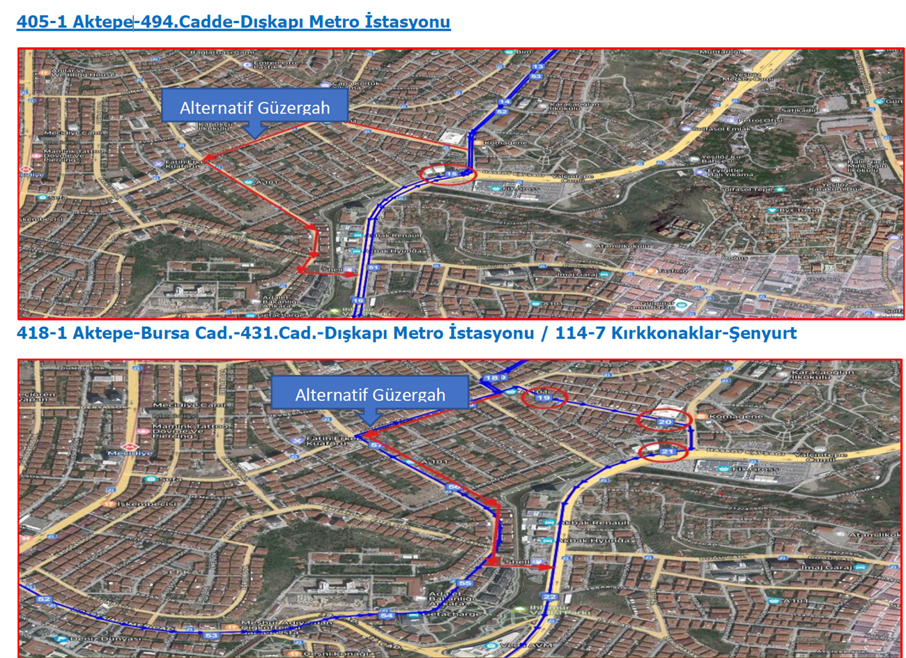 Ayrıca; Aktepe Hareket Noktasından yönlendirilen 405-1, 418-1 EGO hat nolu ve 114-7 (ÖHO) nolu hat güzergahlarında alternatif güzergâh kullanılmakta olup, yapılan yol çalışmasının bitiş süresine kadar, bahse konu hatlarımız Krokide belirtilen güzergahı kullanacaklardır.