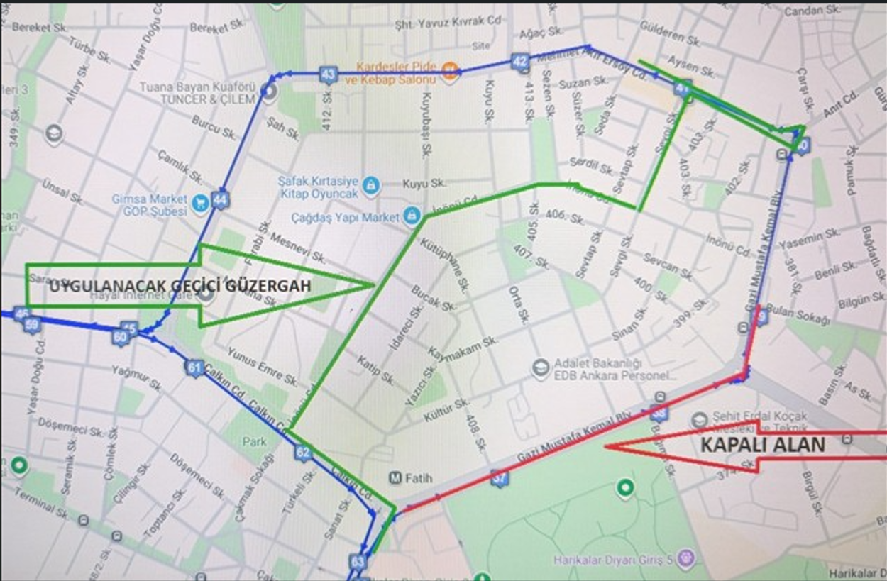 Gazi Mustafa Kemal Bulvarı üzerinde başlatılan yol çalışması nedeniyle 509, 515, 516, 517, 549, 616 hatlarının güzergahı üzerinde bulunan 50392, 50497, 50499 no’lu EGO duraklarına geçici süre hizmet verilemeyecektir. Araçlarımız Çalkın caddesi, İnönü caddesi ve Sevgi sokağını kullanarak güzergaha bağlanacaktır.