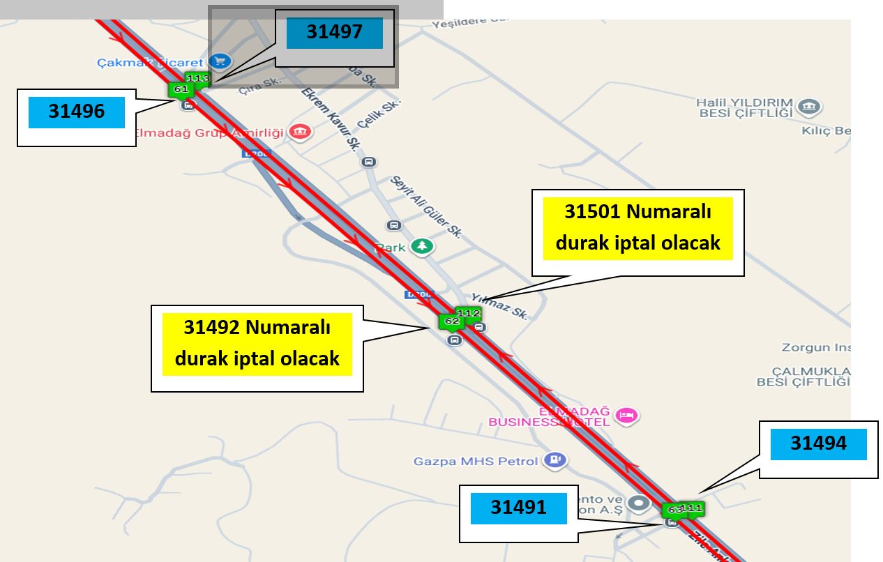 19 Mayıs Bulvarı Ankara Kırıkkale Yolu üzerinde bulunan 31501 ve 31492 numaralı durakların bulunduğu yerde köprü çalışması olduğundan dolayı 354 Elmadağ-Siteler-Gülveren-Gençlik Parkı Hattımızın yolcuları 19 Mayıs Bulvarı Ankara Kırıkkale Yolu üzerinde bulunan 31497, 31496, 31494, 31491 numaralı durakları kullanılması gerekmektedir.
