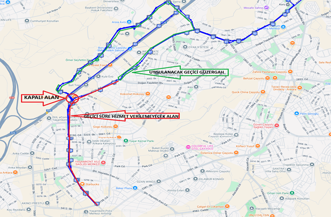 Yaşamkent Köprüsü üzerinde Fen İşleri Ekiplerince başlatılan kaldırım çalışması dolayısıyla, çalışma tamamlanana dek 576 Koru Metro İstasyonu-Venüskent-Yaşamkent-Ümit Mahallesi hattımızın güzergâhı üzerinde yer alan 10147, 10119, 10110, 10109, 14649, 13270, 14653, 14648, 14649, 14650, 14651, 14652, 10144, 13954 ve 13955 numaralı duraklara geçici olarak hizmet verilemeyecektir.