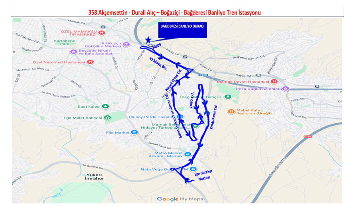 358 Akşemsettin - Durali Aliç – Boğaziçi - Bağderesi Banliyö Tren İstasyonu; Ege Hareket Noktası, Nata Vega AVM, 2309. Cadde, Natoyolu Caddesi, Doğukent Caddesi, 1093. Sokak, 1081. Sokak, 1068. Sokak, 1080. Cadde, 928. Cadde, 922. Cadde, 980.Sokak, 976. Sokak, 970.Cadde, Şehit Hakan Yorulmaz Caddesi, Neşet Ertaş Caddesi, 19 Mayıs Bulvarı, 1259. Sokak, 616.Cadde, 19 Mayıs Bulvarı, Neşet Ertaş Caddesi, Şehit Hakan Yorulmaz Caddesi, 970.Cadde, 976. Sokak, 980.Sokak, 928. Cadde, 1080. Cadde, 1068. Sokak, 1081. Sokak, 1093. Sokak, Doğukent Caddesi, Natoyolu Caddesi, 2309. Cadde, Nata Vega AVM, Ege Hareket Noktası