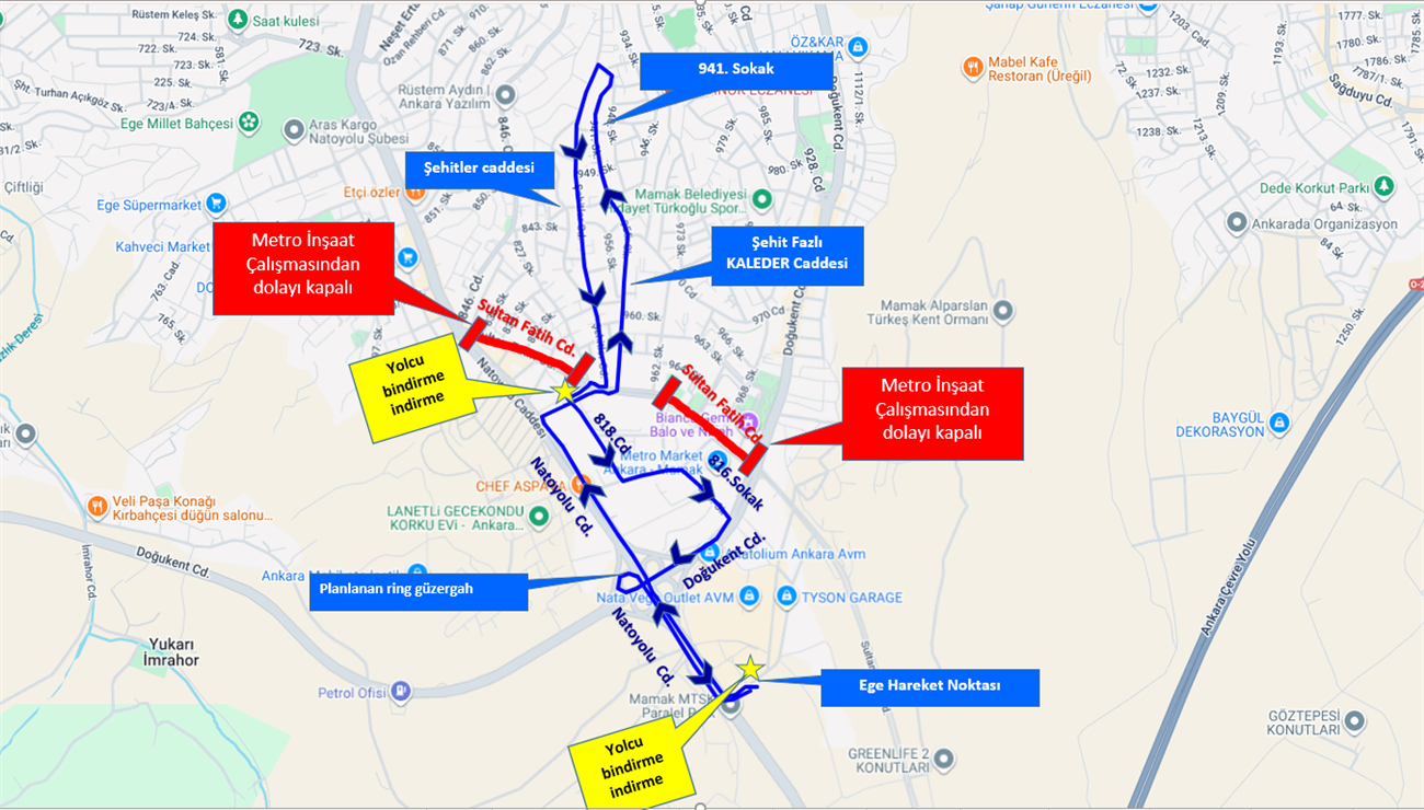 Vatandaşlarımızın mağduriyet yaşamamaları için 340, 340-2, 341, 338, 346, 307, 337, 731, 732, 341-6 numaralı otobüs hatlarımızın yönlendirileceği alternatif güzergahlarda yaşanması muhtemel trafik akışındaki yoğunluğun bertaraf edilmesi amacıyla 14.02.2026 tarihi itibariyle 339 Ege Hareket Noktası-Natoyolu- Şehitler Caddesi EGO Ring hattı ile toplu taşıma hizmeti verilmeye başlanılacaktır. 340, 340-2,341, 338, 346 numaralı otobüs hatlarımız Şehit Fazlı KALEDER Caddesi,941. Sokak, Şehitler Caddelerine girmeyecek olup, bu Caddelere 339 Ege Hareket Noktası-Natoyolu- Şehitler Caddesi EGO Ring hattı hizmet verecektir.