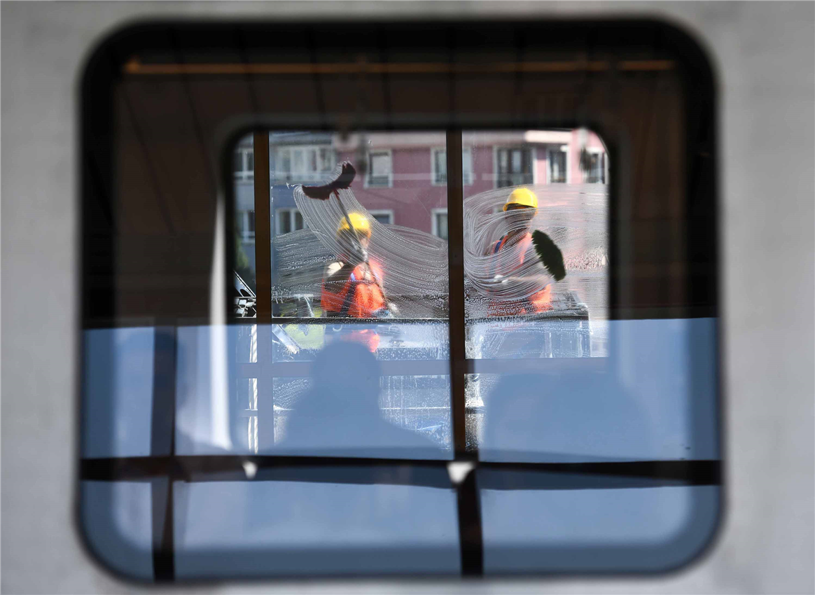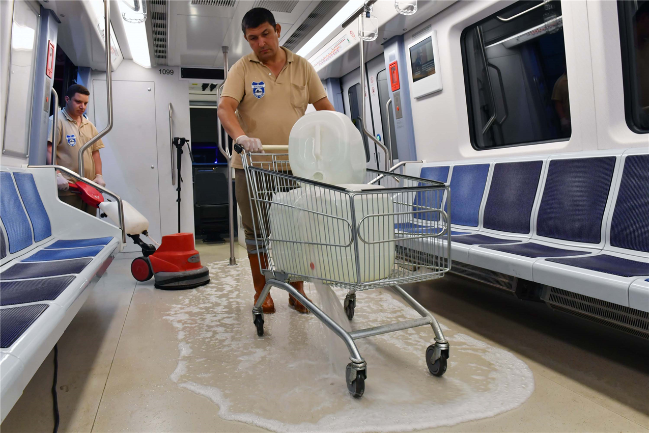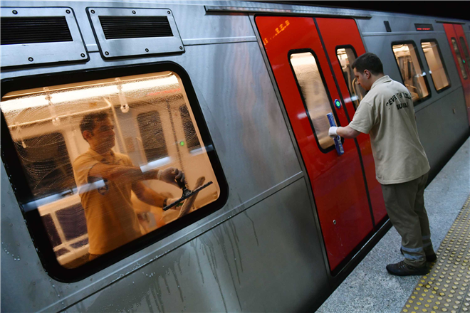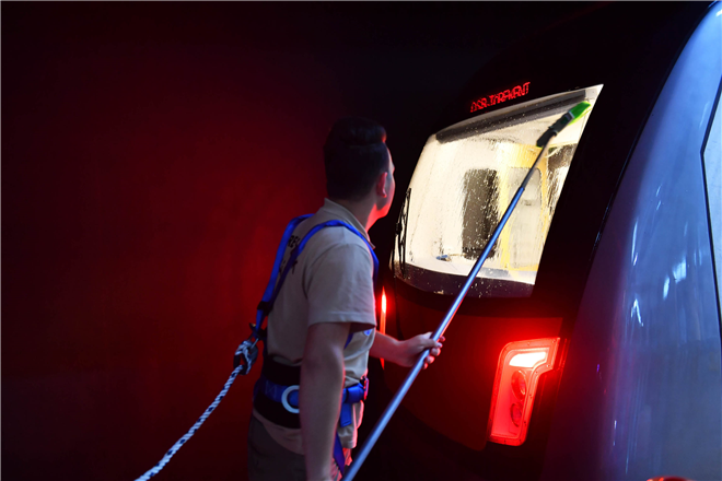 Metro vagonları temizlik ekipleri tarafından su ve özel cihazlarla kirden arındırılırken, yolcu koltukları ve camların dışında yolcu tutamaklarına kadar temizlik yapılıyor.