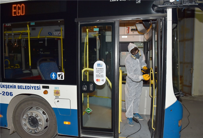 ANKARA BÜYÜKŞEHİR BELEDİYESİ GÜNLÜK YAKLAŞIK 800 BİN YOLCUNUN SEYAHAT ETTİĞİ EGO OTOBÜSLERİNDE DEZENFEKTE VE İLAÇLAMA ÇALIŞMASI YAPIYOR
