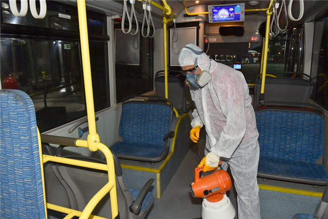 Çevre Koruma ve Kontrol Daire Başkanlığı ekipleri tarafından ilaçlama çalışmaları otobüslerin servis dışına çıktığı gece saatlerinde titizlikle yürütülüyor.