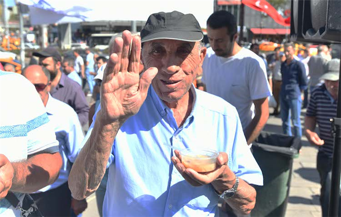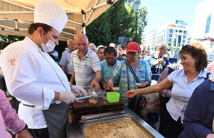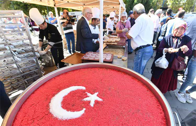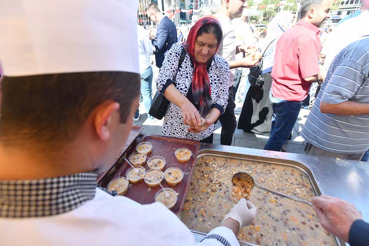 Okunan duanın ardından, belediye görevlileri binlerce vatandaşa plastik kaselerdeki aşureleri hazırlayarak tek tek ikram ettiler.
