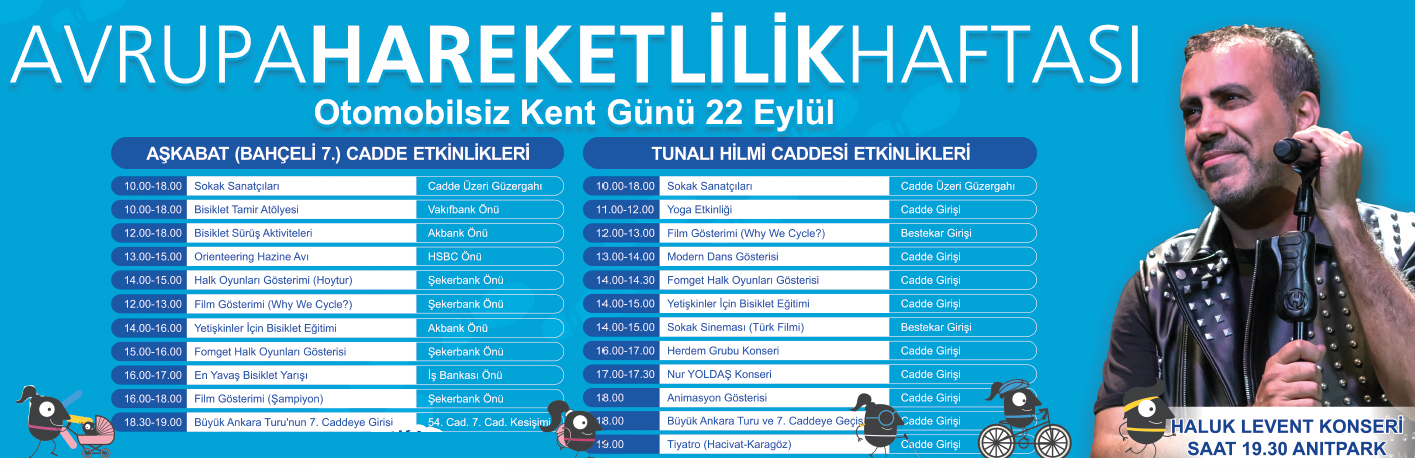 “Büyük Ankara Turu bu etkinliğin en önemli ayağı olacak. 22 Eylül 2019 Pazar günü saat 18.00’de Ankara Büyükşehir Belediye Başkanımız Sayın Mansur Yavaş, Avrupa Birliği Delegasyonu Başkanı Büyükelçi Sayın Christian Berger ve AB üyesi ülkelerin büyükelçileri, STK’lar, üniversite rektörleri ile vatandaşlarımızın katılacağı Büyük Ankara Turu yapılacak. Kortej, önde bisikletlilerle birlikte Tunalı Hilmi Caddesi’nden hareket ederek, Kennedy Caddesi, Atatürk Bulvarı, GMK Bulvarı, Dögol Caddesi, Mareşal Fevzi Çakmak Caddesi, Akdeniz Caddesi, Kazakistan Caddesi ve 54. Cadde üzerinden Aşkabaat Caddesi’ne geçilerek Anıtpark’ta son bulacak. Tüm bisikletlileri ve yayaları Ankara’nın en büyük turuna bekliyoruz. Büyük Ankara Turu’nun ardından Pazar günü saat 19.30’da Anıtpark’ta sevilen sanatçımız Haluk Levent de Başkentlilere bir konser verecek.”