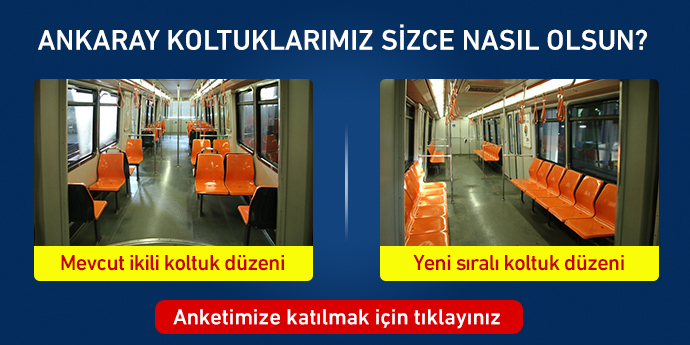 Ankara Büyükşehir Belediyesi, EGO Genel Müdürlüğü’ne bağlı ANKARAY İşletmesi trenlerinde yolcu yoğunluğu nedeniyle, trenlerdeki alanın genişletilerek daha ferah taşıma imkânının sağlanabilmesi için koltuk düzenlemesi yapılması planlanmaktadır. Fikirleriniz bizim için değerli….