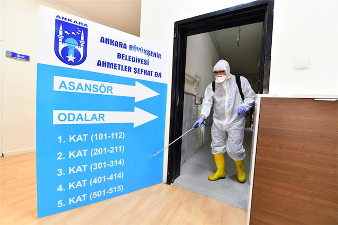 Büyükşehir Belediye Başkanı Mansur Yavaş’ın talimatıyla Ankara’ya tedavi olmak üzere gelen hasta ve hasta yakınlarının konakladığı Şefkat Evlerinde de dezenfeksiyon çalışması yapılıyor.