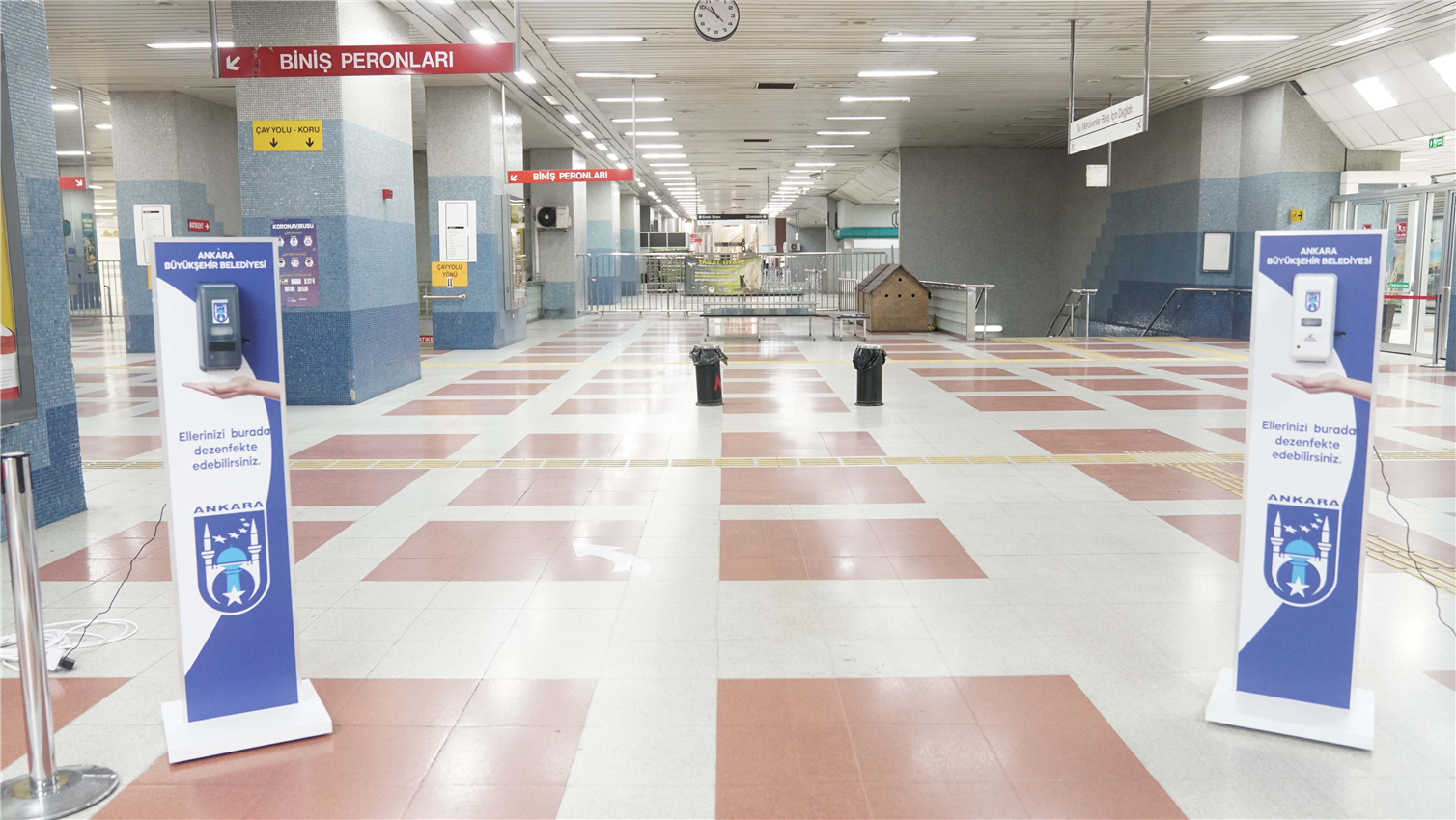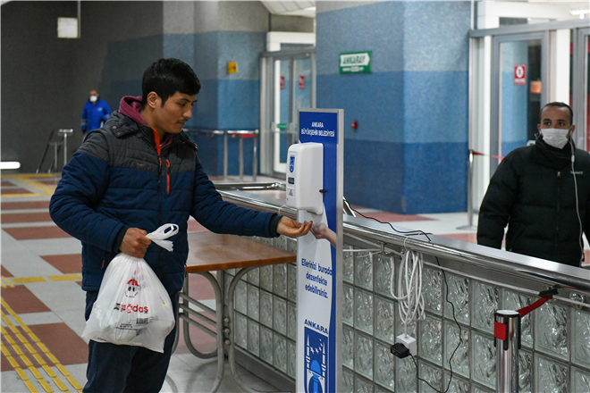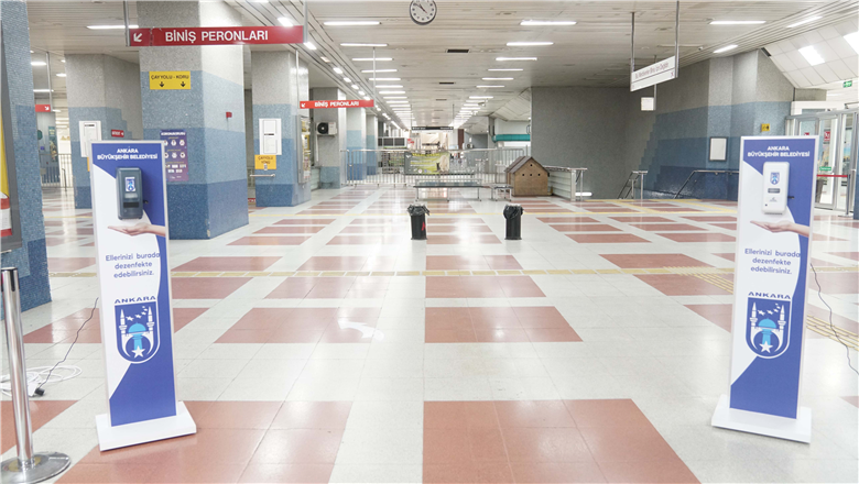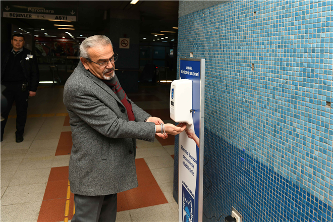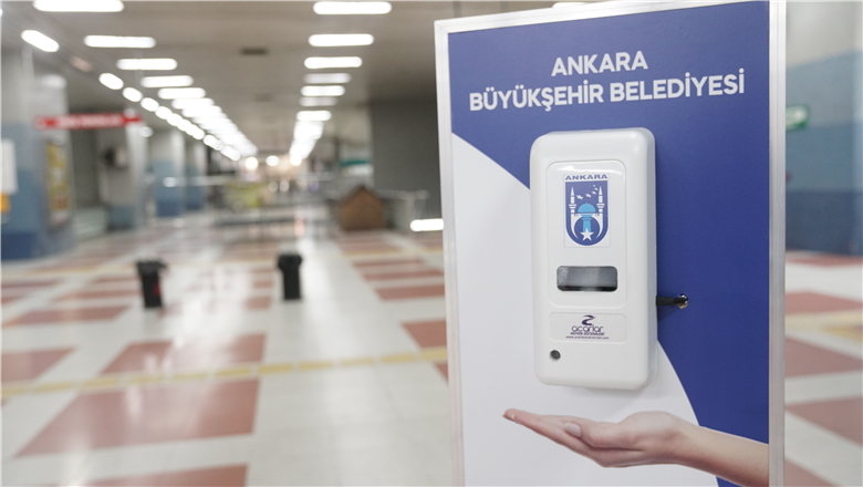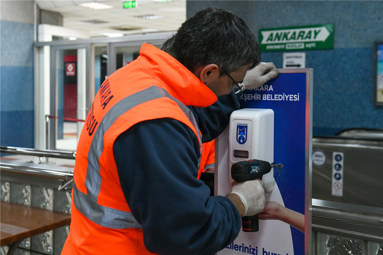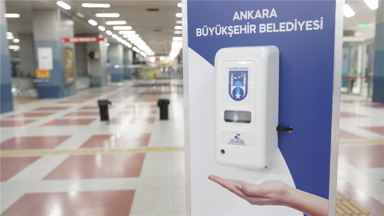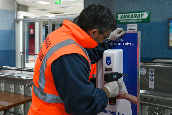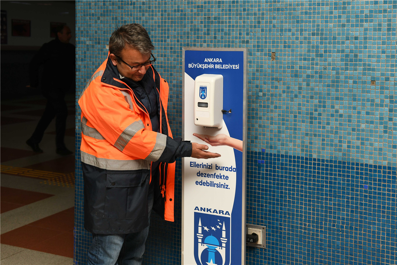 Ankara Büyükşehir Belediyesi tarafından koronavirüse karşı alınan önlemler kapsamında Metro, ANKARAY ve Teleferik İstasyonlarına el dezenfektan otomatları konulmaya başlandı. Ankara Büyükşehir Belediye Başkanı Mansur Yavaş’ın talimatıyla vatandaşların yoğun olarak kullandığı Raylı Sistemlerde başlatılan uygulama ile 100 noktaya sensörlü dezenfektanlar yerleştirilecek.