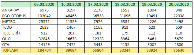 09, 16-20 Mart 2020 Tarihleri Arasında EGO Genel MüdürlüğüToplu Taşıma Araçlarını Kullanan 65 Yaş Üstü Yolcu Sayıları
