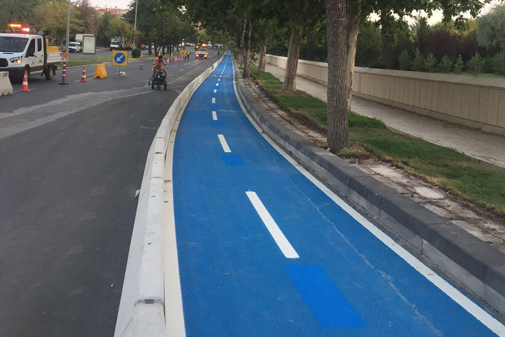 9 etaptan oluşan bisiklet yolunun Anıtkabir önündeki bölümünün çizgilerini çekerek bariyerlerle araç trafiğinden ayıran Büyükşehir Belediyesi, Gençlik Caddesi’ni kullanan Başkentli bisikletseverlere sürpriz yaptı.