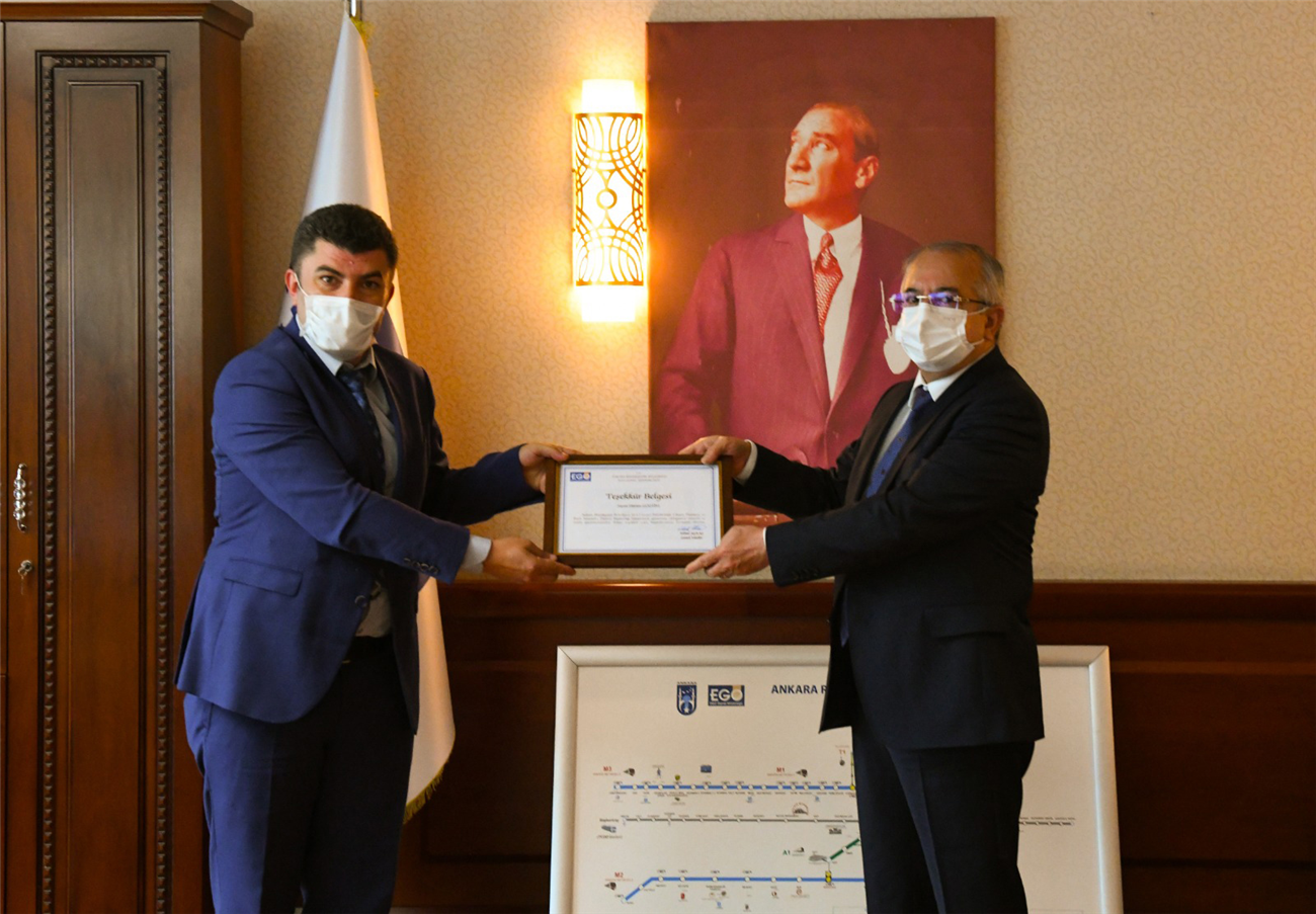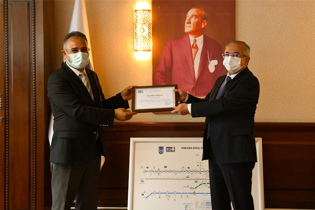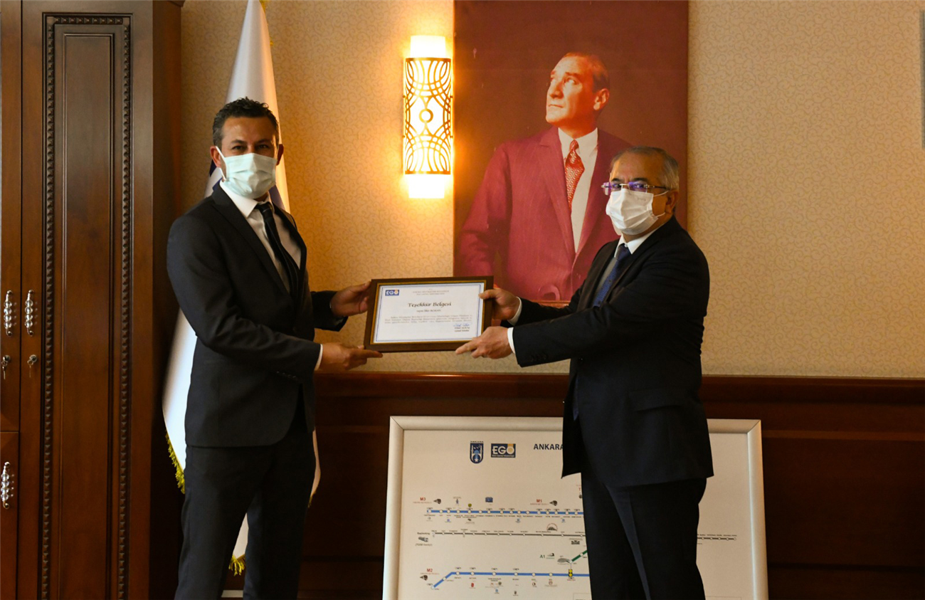 Ankara Metrosu klimalarının tekrar açılmasını sağlayan çalışmanın teknik düzenlemesini yapmış olan EGO personeline, Genel Müdür Nihat Alkaş tarafından teşekkür belgesi takdim edildi.