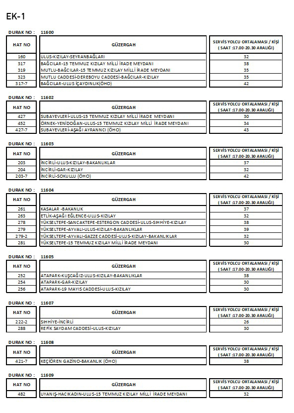 Önünde açıklama yapılan 11604 numaralı otobüs durağımızdan 261 Kasalar-Bakanlık, 263 Etlik-Aşağı Eğlence-Bakanlık, 278 Yükseltepe-Sancaktepe-Estergon Caddesi-Ulus-Sıhhiye-Kızılay ve 279 Yükseltepe-Ayvalı-Ulus-Kızılay Bakanlıklar hat numaralı araçlarımız yolcu almakta olup akşam mesai dağılış saatlerine uygun olarak saat 17.00’den itibaren ortalama 10 dakikada bir servis verilmektedir. Diğer duraklardan hareket eden araçlarımızın da saat 20.30’a kadar ortalama durağa geliş süreleri 10 dakika civarındadır. Yani haber metninde ve videoda ifade edildiği gibi durakta bekleyen vatandaşlarımız, tek bir durak alanından, tek bir güzergâhın aracını değil, 9 adet durak alanında 24 adet güzergâhtan gelecek araçları beklemektedir. Durak numaraları ve durağa gelen araçların saat 17.00-20.30 aralığındaki servis yolcu ortalamaları 35 kişi olup ek tabloda (EK1) görülmektedir.