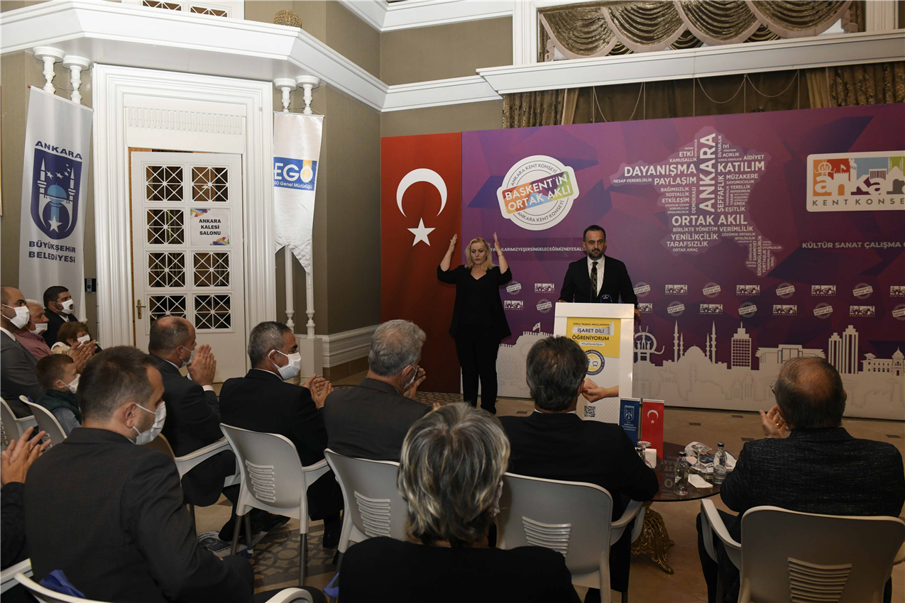 ‘‘Bildiğiniz üzere Dünya Belediyeler Başkanı Başkent yarışmasında birinci oldu Ankara. Mansur Bey ödülü 6 milyon Ankaralının adına kabul ettiğini söyledi dolayısıyla kentin öne çıkması ve uluslararası arenada bilinirliliğini artırması buradaki katılımcılığın ödüllendirilmesi 6 milyon Ankaralının o tek yürek diye tanımladığımız Ankaralıların kendisini mutlu etmesini sağlıyor. Ankara bunu hak edecek ne yaptı? Kavga kenti olan Ankara barışın, huzurun, katılımcılığın ve bereketin kenti oldu. Mansur Yavaş bu kentteki kavgayı bitirdiği için dünya markası oldu. Biz Ankara Kent Konseyi’nde işaret dilini öğreniyorum projesini ilk engelli meclisimize iletildiği zaman EGO Genel Müdürümüzün konuya ne kadar ilgili olduğunu görünce çok mutlu olduk. Burada katılımcılığın her boyutuyla 4 binden fazla EGO şoförünü büyük bir sorumlulukla bu eğitime alması ne kadar değerli. Ankara’da metroları kullanan 1 milyondan fazla yurttaşın bu konuda farkındalığın gelişmesi bütün kent ekranlarında bu duygunun ilerlemesi kentin tamamının kenetlenmesini sağlayacak. İşaret dilini öğreniyorum projesinde hayatın içerisinde konforunu artırdığımız arkadaşlarımızın hayata, kente ne katabileceklerini biz biliyoruz bu duygularla bu projenin yapılmasından bu güne kadar emek veren herkes bizim gözümüzde eşittir. Bu kent iklimini oluşturduğunuz için sizlere Kent Konseyi birleşenleri adına şükranlarımı sunuyorum.’’