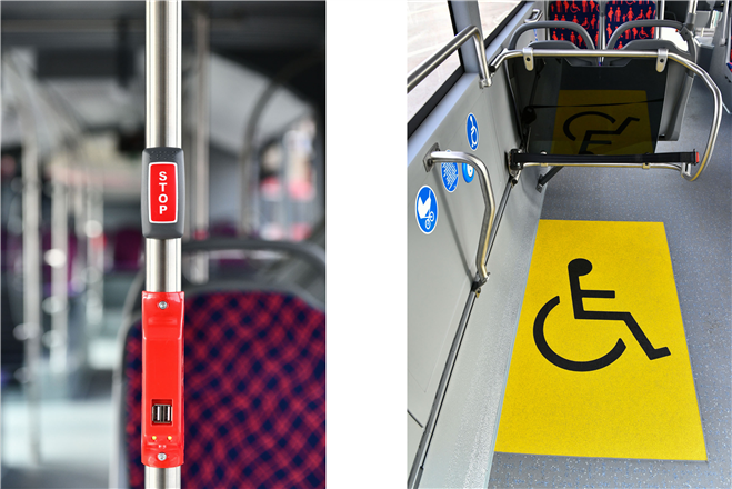 Alçak tabanlı, klimalı, bisiklet taşımaya uygun, yolcu bilgilendirme ekranları, anons sistemi ve çift girişli USB girişi bulunan otobüslerde ayrıca yaşlı, hamile ve engelli yolcular için geniş koltuk ve tekerlekli sandalyelere özel alanlar yer alıyor.