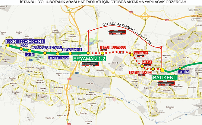 10 Ağustos-10 Eylül 2022 tarihleri arasında planlanan çalışma esnasında İstanbul Yolu, Botanik, Mesa ve Batı Merkez İstasyonlarında işletme yapılmayacak. Çalışma sırasında mağduriyet yaşanmaması için vatandaşlar, Eryaman 1-2 ve Batıkent İstasyonları arasında otobüs aktarmasıyla taşınacak.