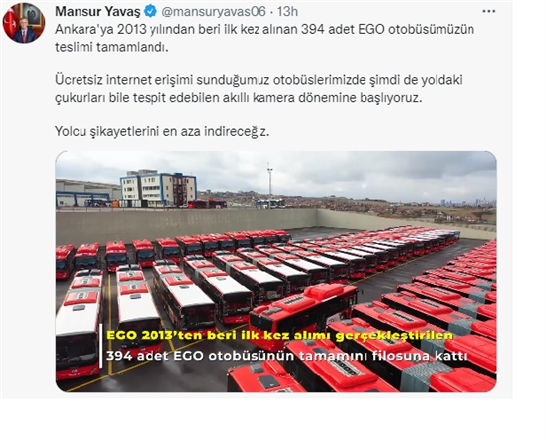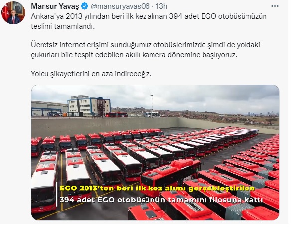 “Ankara’ya 2013 yılından beri ilk kez alınan 394 adet EGO otobüsümüzün teslimi tamamlandı. Ücretsiz internet erişimi sunduğumuz otobüslerimizde şimdi de yoldaki çukurları bile tespit edebilen akıllı kamera dönemine başlıyoruz. Yolcu şikâyetlerini en aza indireceğiz.”