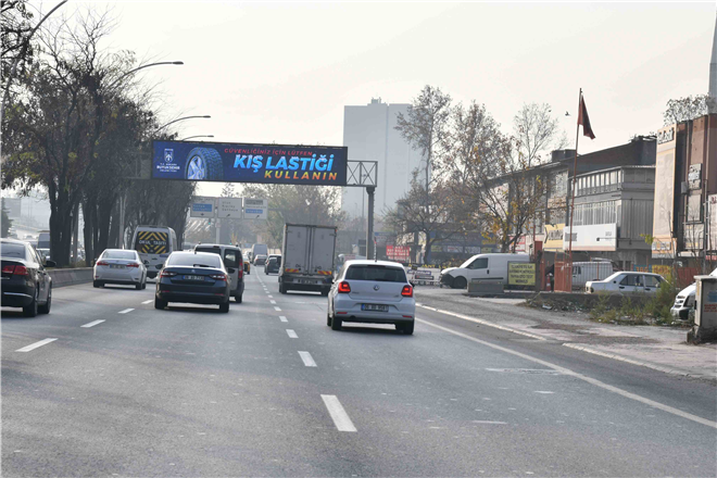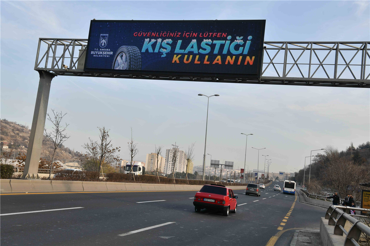 Vatandaşların sorunsuz bir kış mevsimi geçirmesi için her türlü tedbiri alan Ankara Büyükşehir Belediyesi, bulvarlarda bulunan trafik ekranları ile Başkentli sürücüleri de araçlarını kış koşullarına uygun hâle getirmeleri ve yazlık lastiklerini kullanmamaları konusunda uyarıyor.