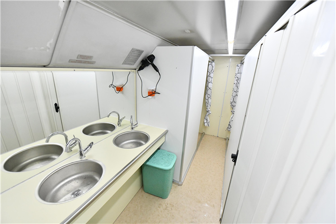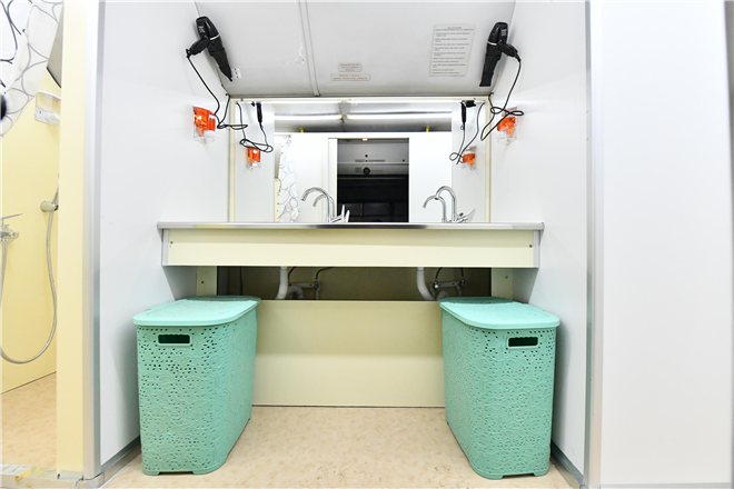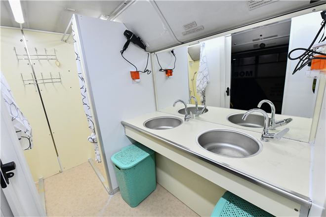 Dönüşüm tamamlandıkça deprem bölgelerine doğru yola çıkan 6 kişi kapasiteli mobil duşların içerisinde lavabo, şampuan, sabun, saç kurutma makinesi ve havlu da yer alıyor.
