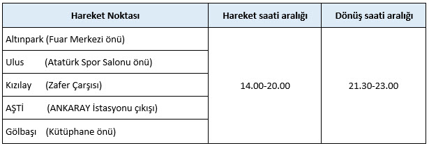 Kuruluşumuzca, açılış programına katılacak vatandaşlarımızın ulaşımlarının sağlanması amacıyla, 14.00-20.00 saatleri arasında, aşağıda belirtilen hareket noktalarından etkinlik alanına ücretsiz otobüs seferleri düzenlenecektir.