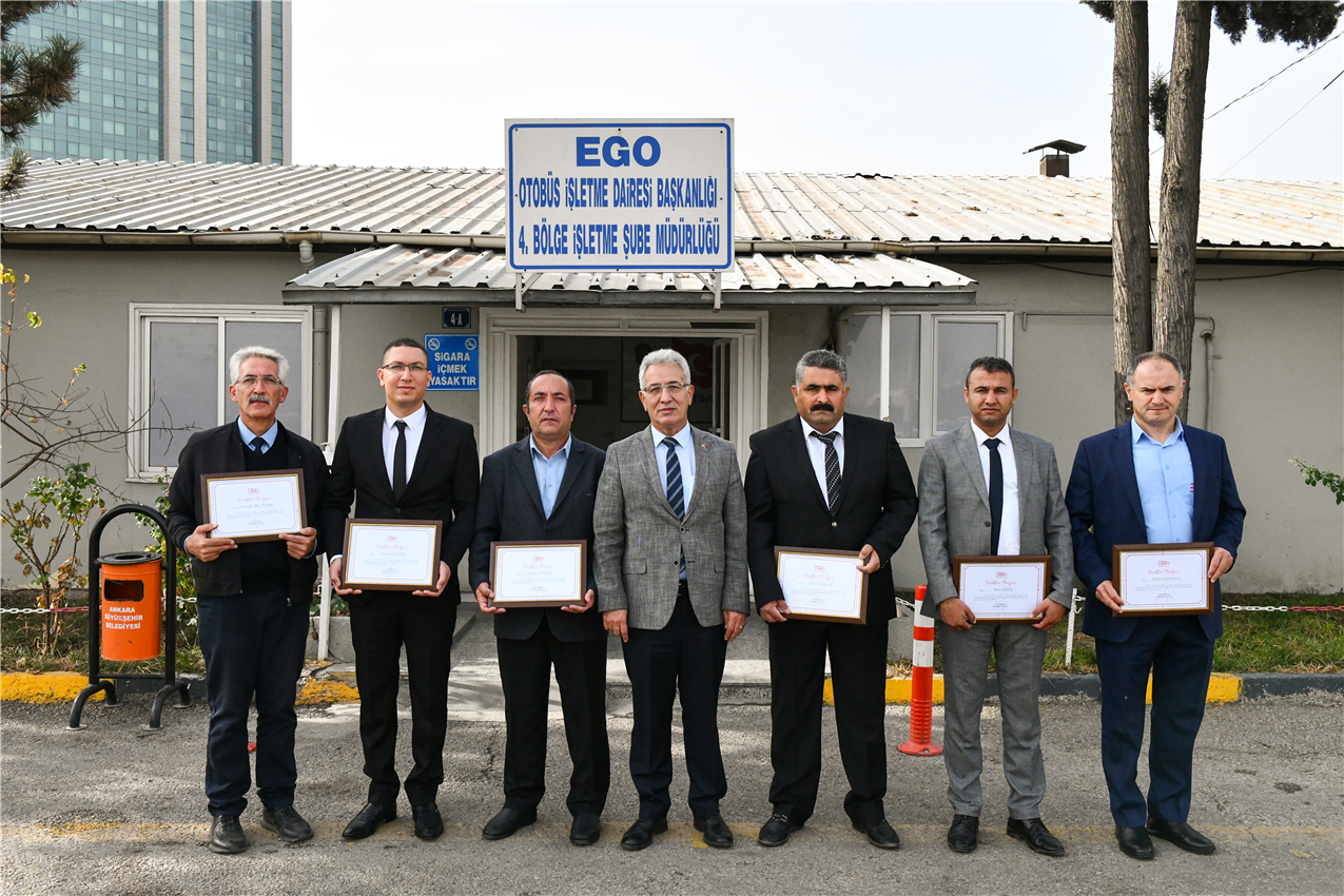 EGO Genel Müdür Yardımcısı Zafer Tekbudak, Hizmet İyileştirme ve Kurumsal Gelişim Dairesi Başkanı Ayten Gök ve Otobüs İşletme Dairesi Başkanı Yahya Şanlıer teşekkür belgelerini takdim etmek üzere “Ayın Şoförleri” ile 4. Bölge Otobüs İşletme Müdürlüğü’nde bir araya geldi.