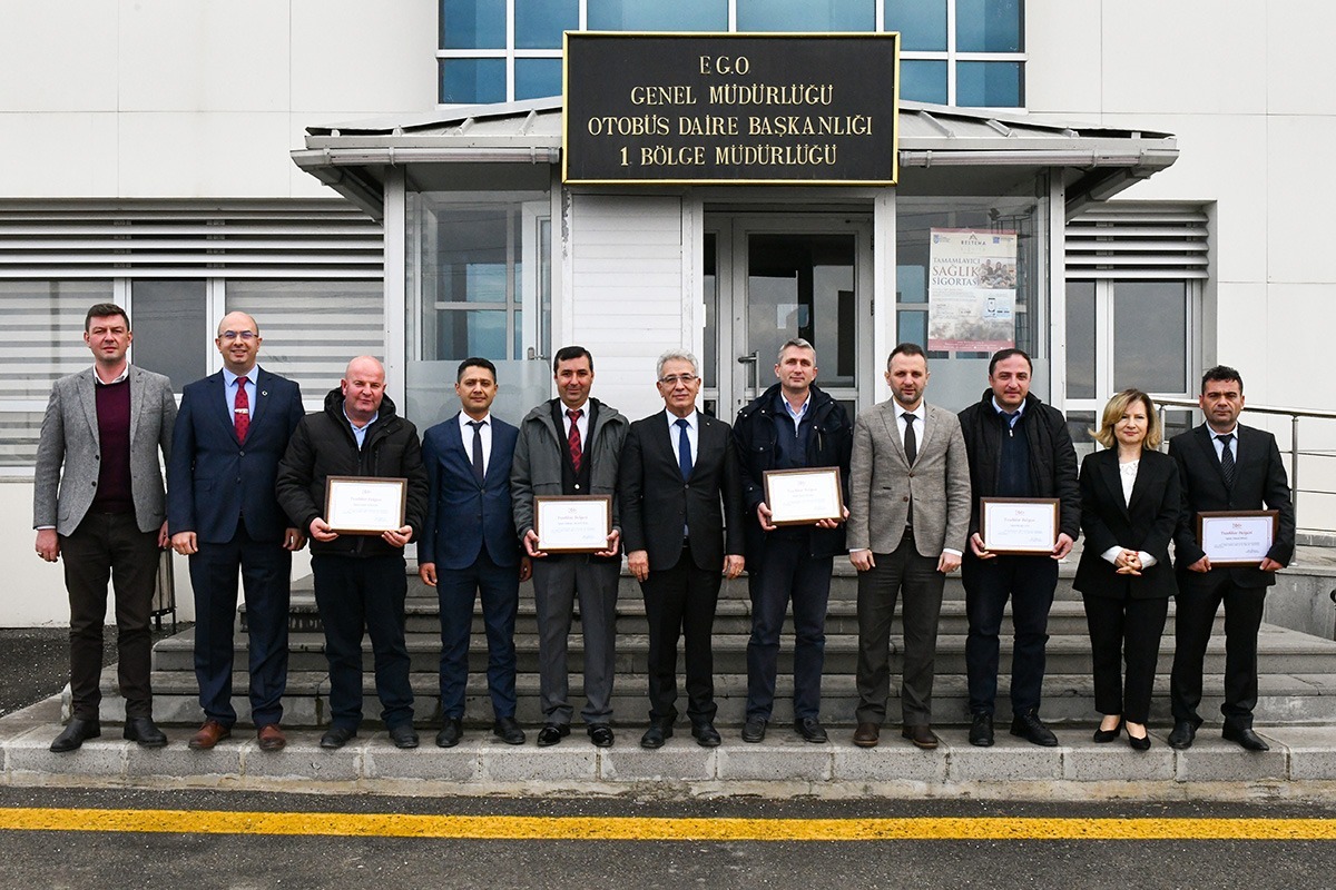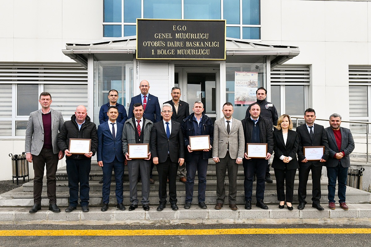 EGO Genel Müdür Yardımcısı Zafer Tekbudak, Otobüs İşletme Dairesi Başkanı Yahya Şanlıer ve Hizmet İyileştirme ve Kurumsal Gelişim Dairesi Başkanı Ayten Gök ile birlikte, 1. Bölge Otobüs İşletme Şube Müdürlüğü’nde ödül alan şoförlerimizle bir araya geldi.