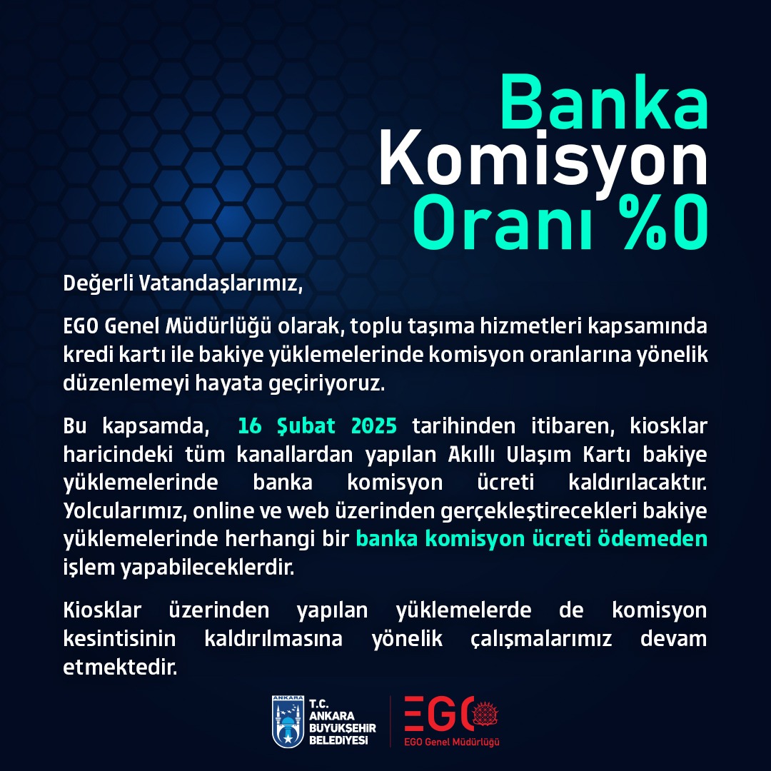 EGO Genel Müdürlüğü olarak, toplu taşıma hizmetleri kapsamında kredi kartı ile bakiye yüklemelerinde komisyon oranlarına yönelik düzenlemeyi hayata geçiriyoruz.