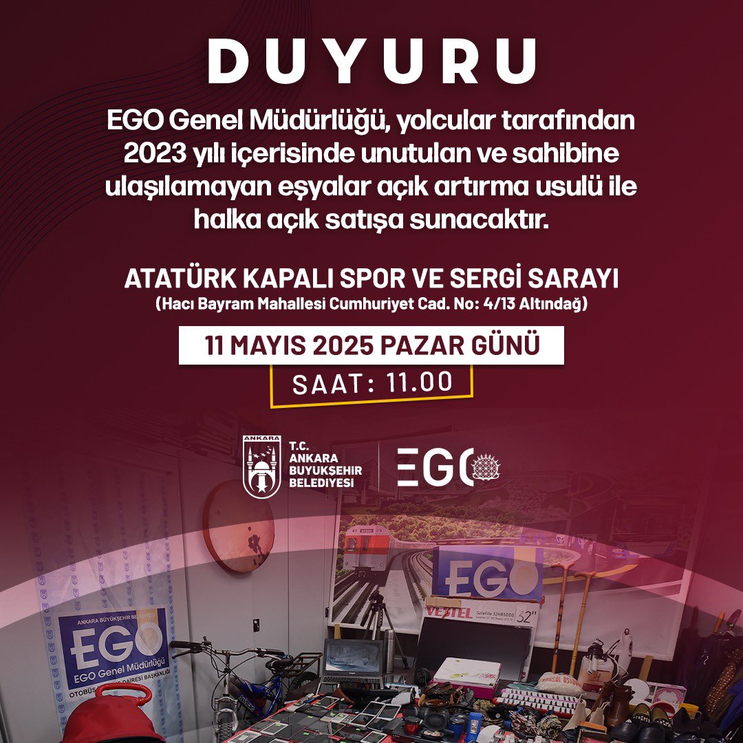 EGO Genel Müdürlüğü, yolcular tarafından 2023 yılı içerisinde unutulan ve sahibine ulaşılamayan eşyalar açık artırma usulü ile halka açık satışa sunulacaktır.