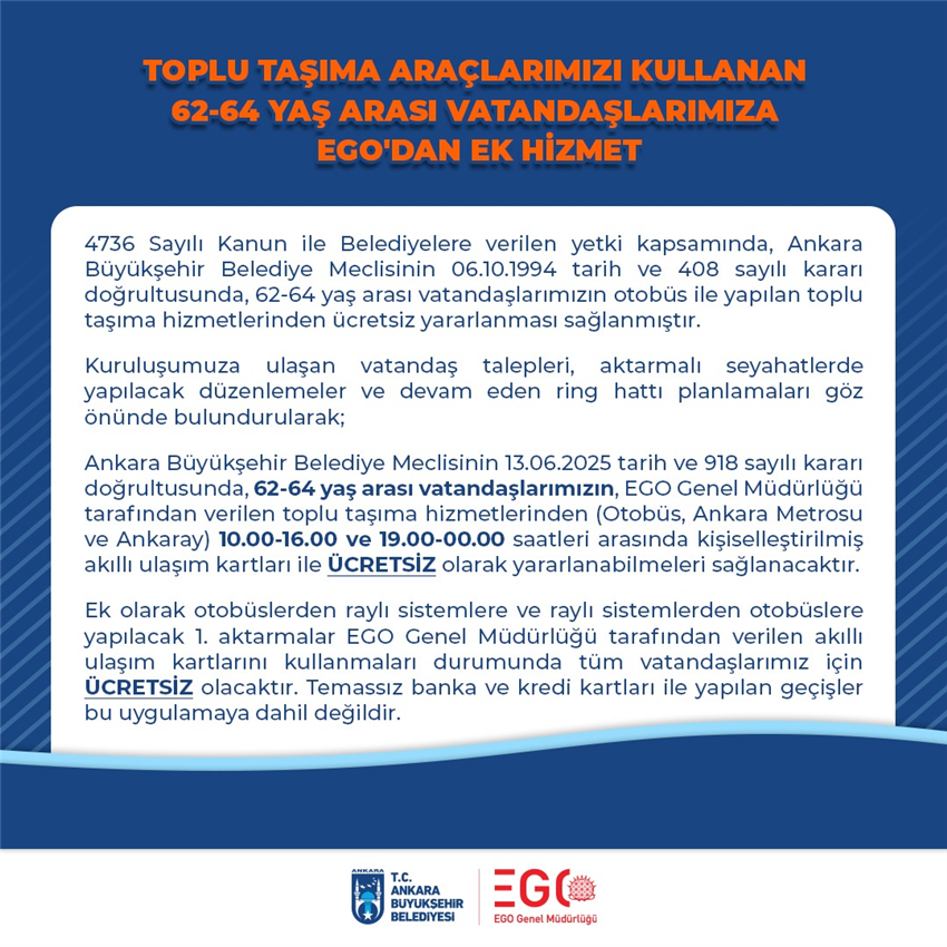 Ayrıca Ankara Büyükşehir Belediye Meclisi kararıyla 62-64 yaş arası vatandaşlar, kişiselleştirilmiş akıllı ulaşım kartlarıyla 10.00-16.00 ve 19.00-24.00 saatleri arasında EGO otobüsleri, metro ve Ankaray’dan ücretsiz faydalanabilecek.