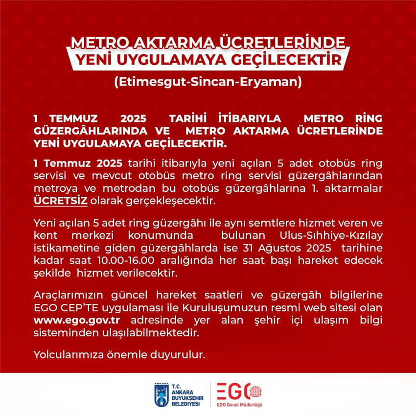 1 Temmuz 2025 tarihinden itibaren, EGO Genel Müdürlüğü’ne bağlı metro istasyonları ile otobüs ring hatları arasında yapılacak ilk aktarmalar ücretsiz olacak.