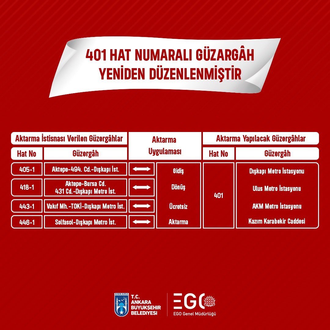 Bu kapsamda; 3 Temmuz 2025 tarihi itibarıyla 401 Dışkapı Metro İstasyonu - Ulus Metro İstasyonu - AKM Metro İstasyonu - Kazım Karabekir Caddesi güzergâhında hizmet verilmeye başlanmıştır. Yeni düzenlemeyle birlikte, tabloda belirtilen otobüs güzergâhlarından 401 numaralı hatta yapılan aktarmalar ücretsiz olarak gerçekleştirilecektir.