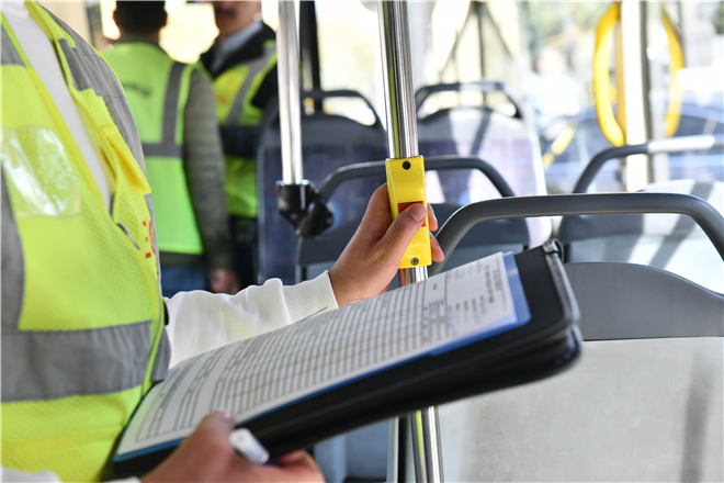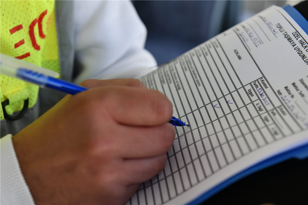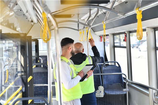 “Kaliteden ve Süreklilikten Taviz Yok” anlayışıyla yürütülen çalışmalarda otobüslerin; kaporta, boya, lastik, koltuk ve klima gibi fiziksel durumları, engelli rampalarının kullanıma uygunluğu, araç takip ve yolcu bilgilendirme sistemleri, güvenlik ve çevresel gürültü yönetmeliğine uygunluk durumları tek tek kontrol ediliyor.